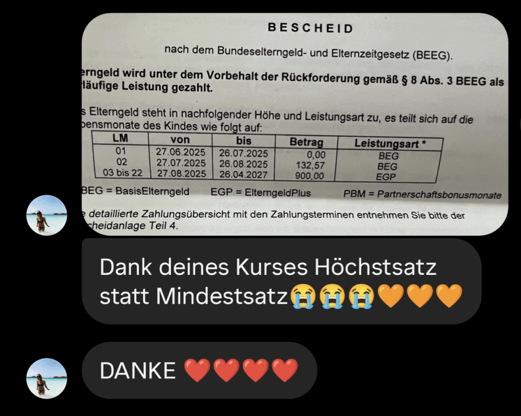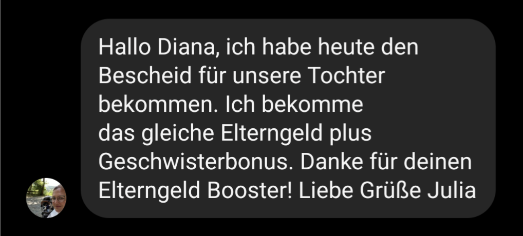 Meine Kundinnen freuen sich regelmäßig über viele tausend Euro mehr Elterngeld beim 2. Kind trotz längerer Elternzeit oder Teilzeit zwischen den Geburten. Dies wird durch das Wissen aus meinem Onlinekurs möglich.